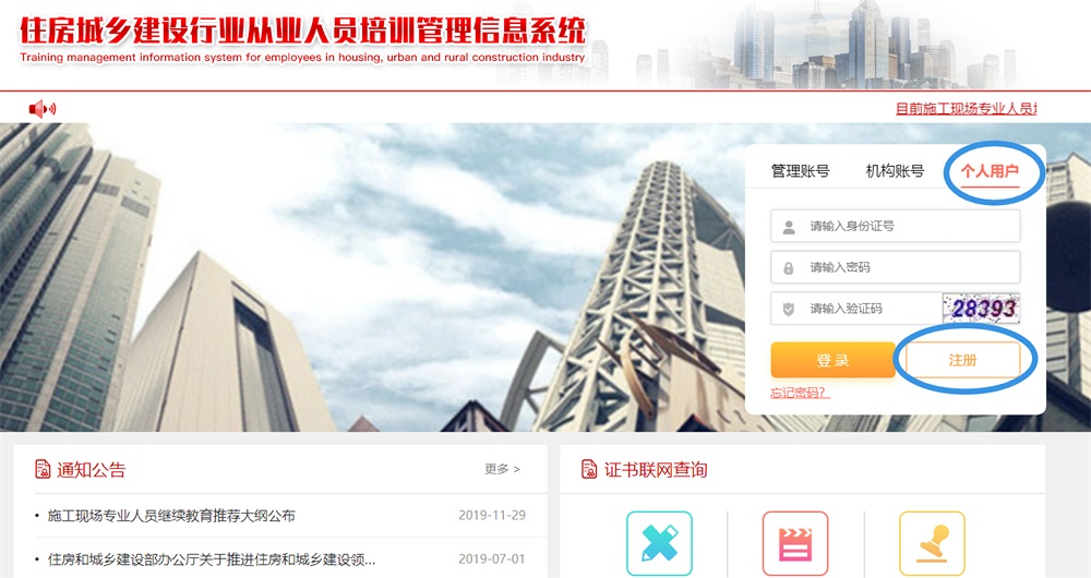 在住房城鄉(xiāng)建設(shè)行業(yè)從業(yè)人員培訓(xùn)管理信息系統(tǒng)(網(wǎng)址http://person.zhujianpeixun.com/)上進行個人注冊;