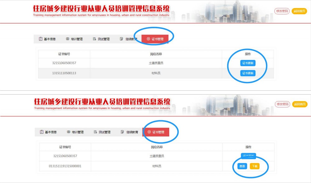 注冊完成后登陸個人中心,在證書管理模塊中選擇已經(jīng)完成繼續(xù)教育的舊證書信息,點擊“證書更新”按鈕,系統(tǒng)自動更新為新電子培訓(xùn)合格證。