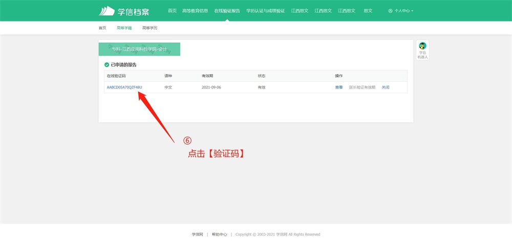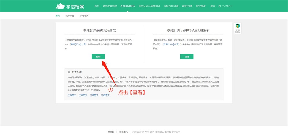 第二步,成功登錄后,點擊頂部菜單中的“在線驗證報告”欄目,可申請《教育部學(xué)籍在線驗證報告》。